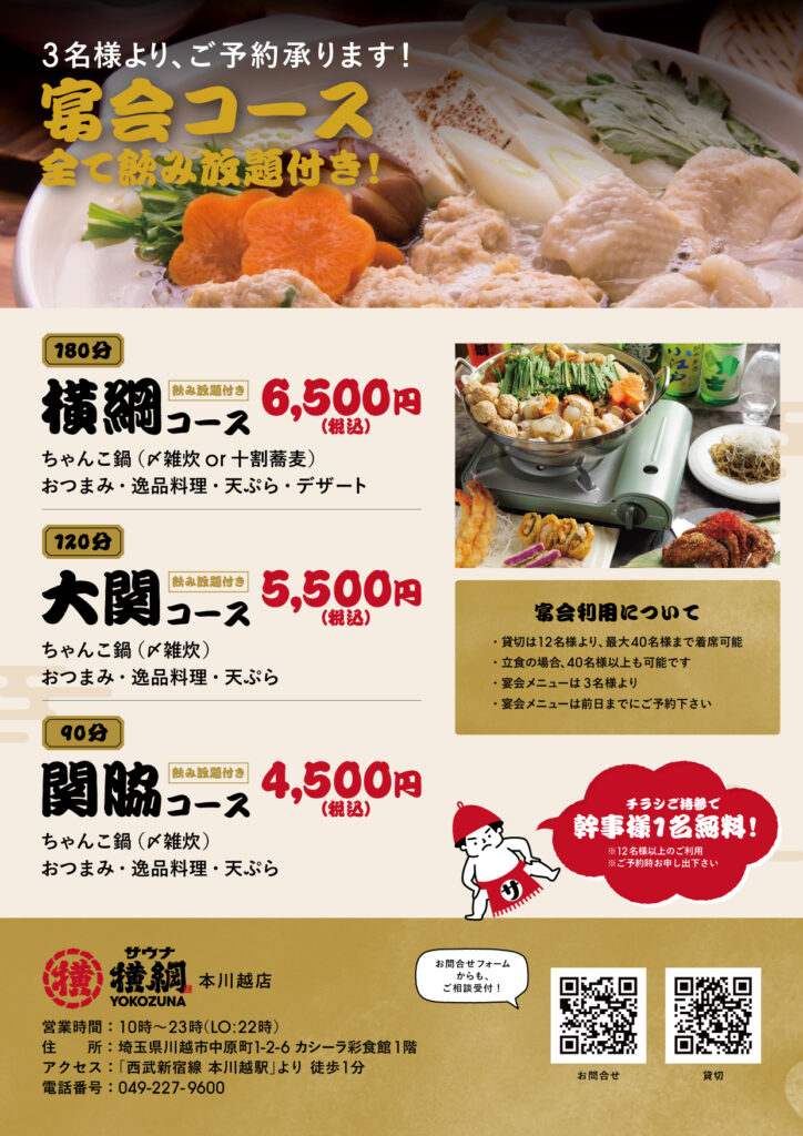 サウナ横綱では「サウナ」と「お食事処」、それぞれ貸し切り利用が可能です。