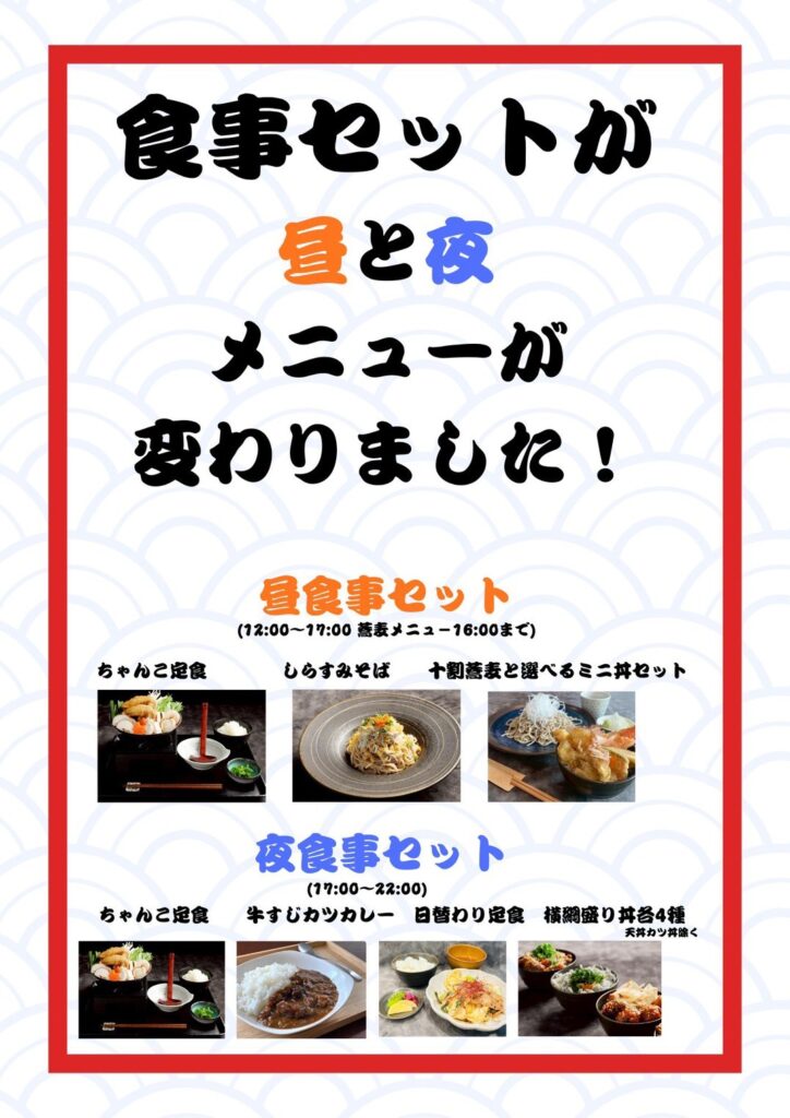 また食事セットについて、夜は別メニューとなりますので、下記別紙をご参照下さい。