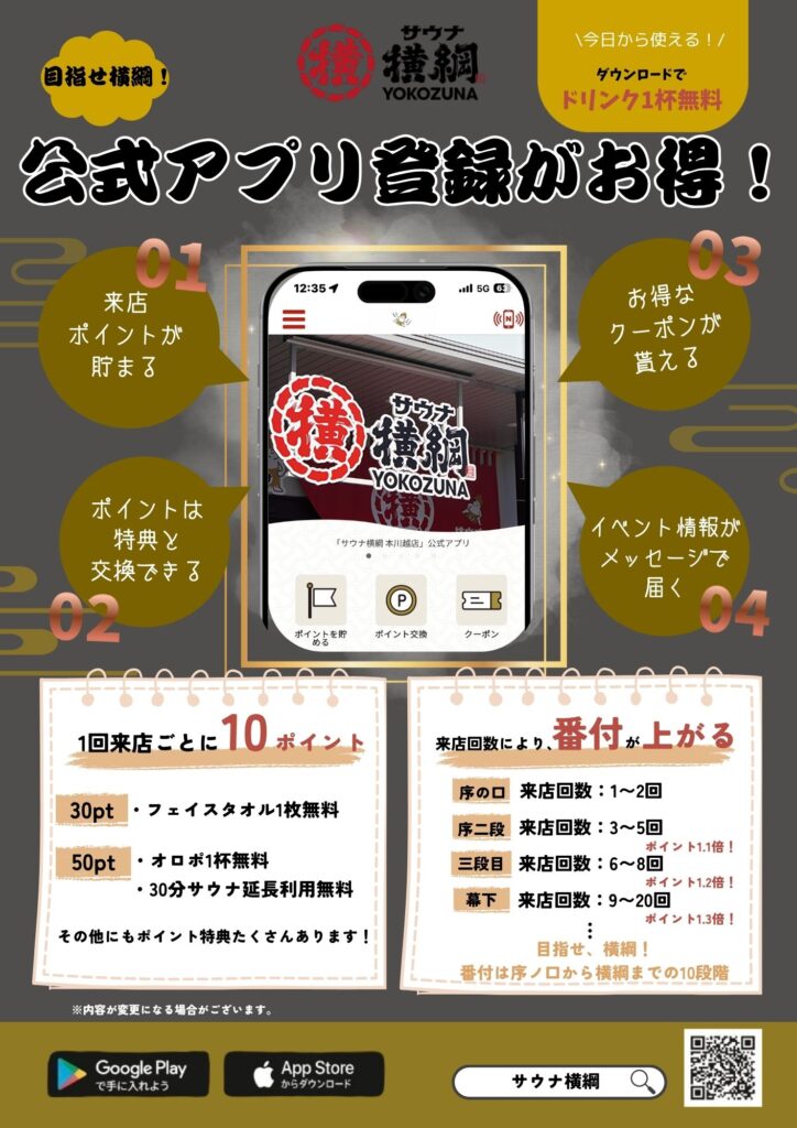 サウナ横綱の公式アプリで、来店ポイントを貯めていただくと、来店回数に応じてランク(番付)が上がります!